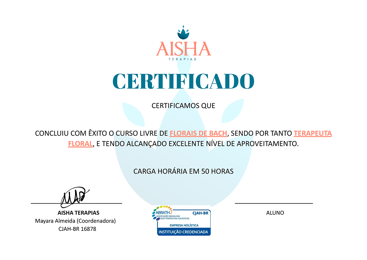 A Aisha Terapias oferece cursos de formação reconhecidos pela ABRATH, com valores simbólicos e acessíveis a todos que desejam buscar esses métodos para transformarem suas vidas!